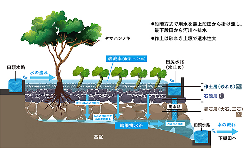 わさび栽培が始まった当初は、「地沢式」と呼ばれる栽培法が主流だった。「地沢式」は、急峻な地形において、3~4%の傾斜があるわさび田に砂礫を敷く、最も古い栽培方式であり、水量の変化が大きい急傾斜地でも築田できるメリットがある。一方、19世紀後半に開発された「畳石式」は、下層から上層へ向けて、大中小の石を順に積み上げ、表層部に砂礫を敷く複層構造。豊富な湧水をかけ流すことで、不純物のろ過、水温の安定、栄養分や酸素の供給を同時に行えるため、わさびの安定生産が可能になる。現在、静岡県内で「地沢式」が残っているのは、一部の急傾斜地のみ。栽培地のほとんどが収益性の高い「畳石式」を採用している。国内には「渓流式」や「平地式」も存在するが、いずれも水量の影響を受けやすく、根茎の肥大化は低い。