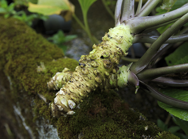와사비는 일본 고유의 십자화과에 속하는 식물이며, 잎과 꽃부터 뿌리까지 전부 매운 맛을 지니고 있습니다. 초밥이나 회에 곁들이는 와사비는 근경(「根茎」 이하, ”뿌리줄기”라 한다)부분을 갈은 것이며 , 나머지 부분은 전부 가공품 원료로서 사용됩니다. 와사비 중에서도 지하수를 이용하여 와사비 논에서 재배하는「물 와사비」와, 산림 속 밭에서 재배하는 「밭 와사비」가 있습니다. 물 와사비는 주로 뿌리줄기 부분을 식용으로 사용하며, 밭 와사비는 주로 잎과 줄기를 가공품 원료로서 사용합니다.
